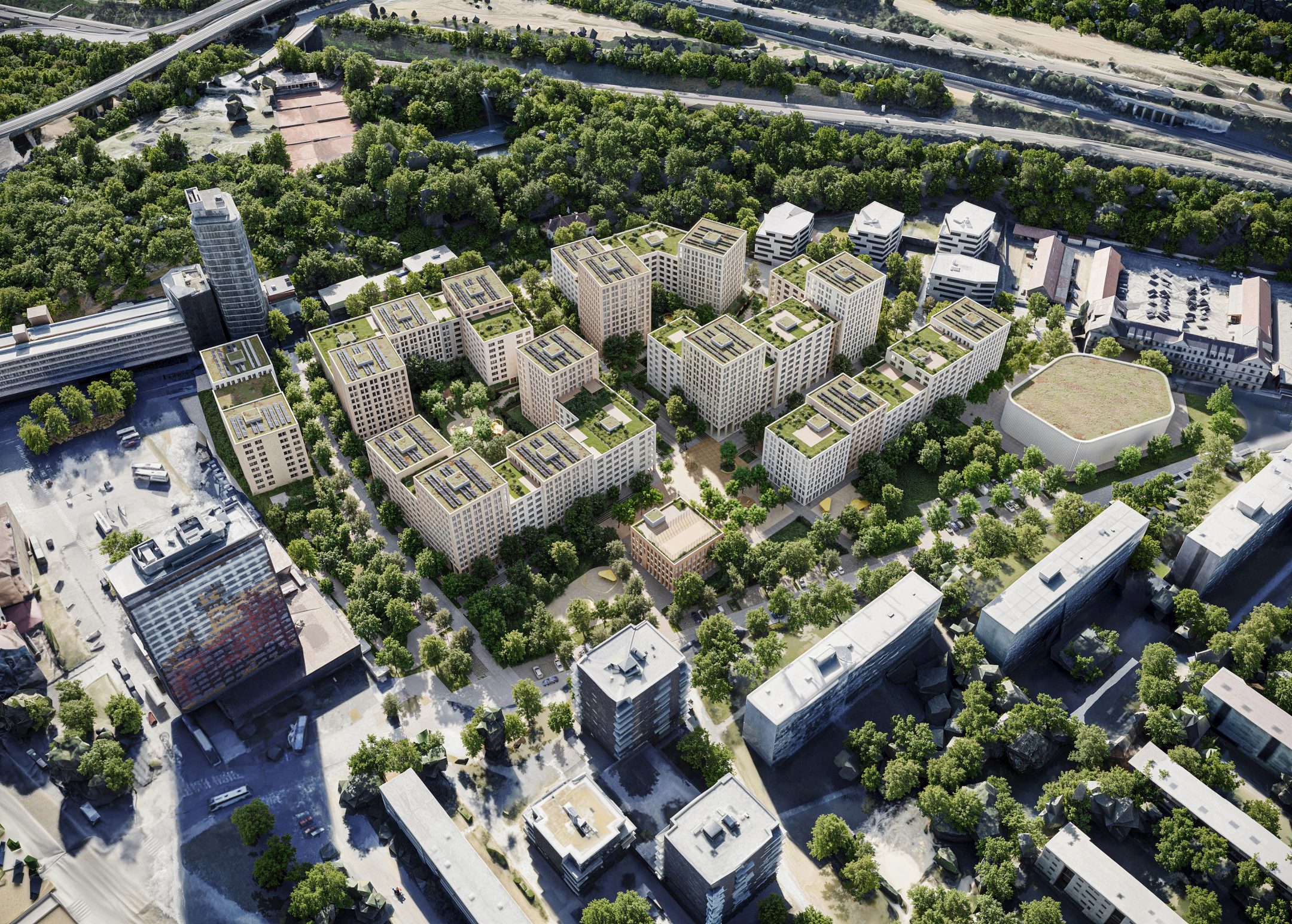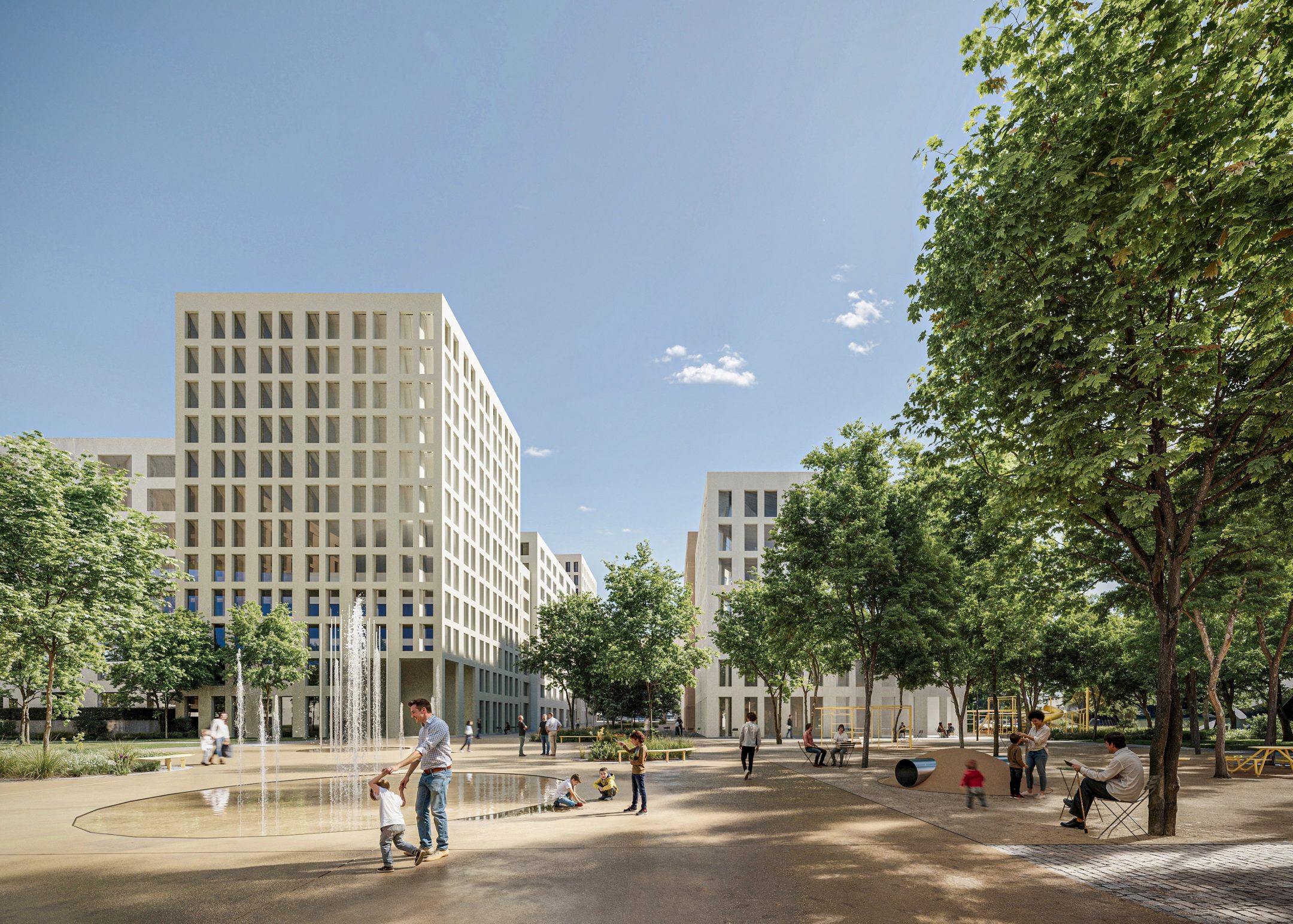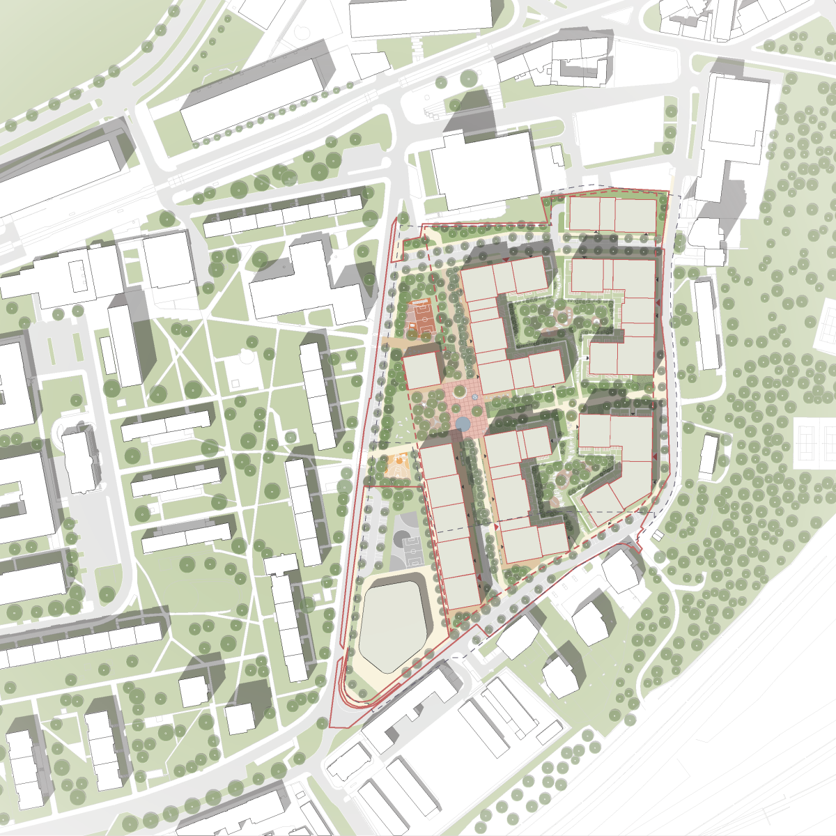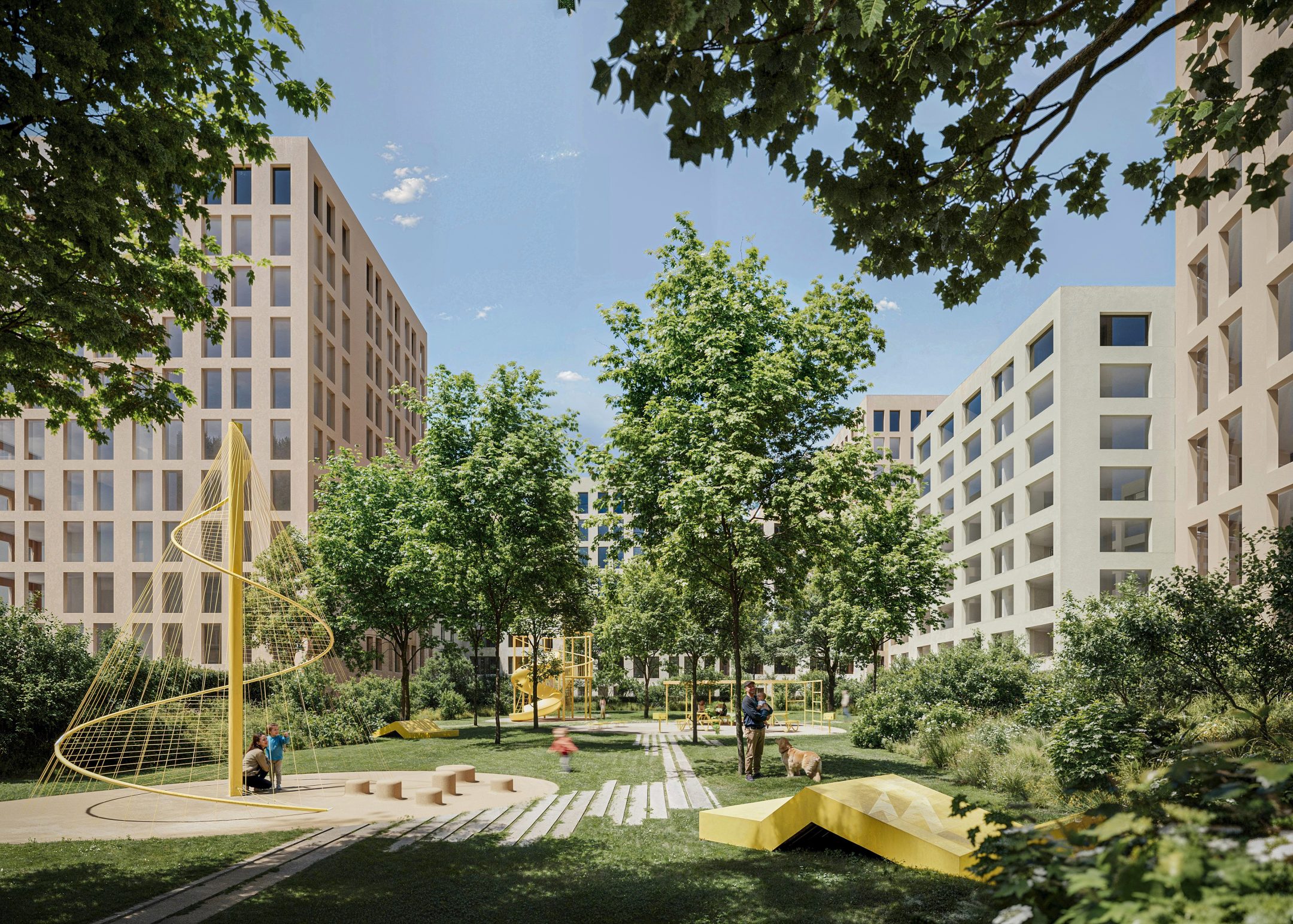 The inner blocks are designed as semi-private green oases with relaxation areas, while green roofs – including biosolar ones – contribute to water retention and the ecological climate of the neighbourhood. The landscape design combines alleys, loose avenues, tree groups and smaller wooded areas in the plaza to create a diverse urban environment.
