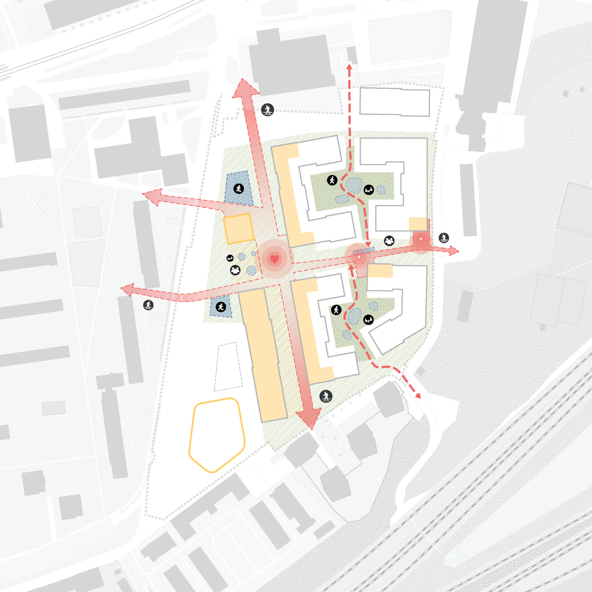 The public spaces are conceived as a hierarchical network combining parks, main “backbone” boulevards, smaller connecting streets and quiet courtyards. The main public spaces provide space for community activities, markets or sport, while the smaller spaces encourage more intimate gatherings and relaxation. This structure ensures a smooth and safe permeability of the area and creates a clearly legible system that supports the daily life of residents and visitors.